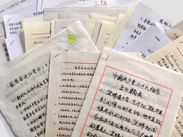 为进一步加深党员职工对党的二十大报告的学习理解,推进党的二十大精神进头脑、进思想,2022年11月26日至12月10日,公司党委组织开展“最感奋我的党的二十大报告金句”推荐活动。 通知一经下发,虽处疫情居家办公期间,但大家的积极性丝毫不受影响。公司领导班子成员率先垂范,结合参加国务院国资委培训中心学习贯彻党的二十大精神网络培训班学习收获,原原本本学习党的二十大报告原文,共推荐金句112条。党员职工认真学习党的二十大报告,深刻理解报告中的新论断、新要求、新部署,怀着崇敬的心情,一字一句工整地抄写着金句,并表示,作为国企职工,要深入学习贯彻党的二十大精神,立足本职、积极工作。十分公司王帅表示,通过摘抄党的二十大报告金句,又是一次原原本本学习,通过抄写,对报告内容又有新理解、新收获,中国共产党为人民谋幸福,从来都是动真情、出实招、办实事。“作为一名党员,要当好干事先锋员,以奋发有为的姿态抓工作落实。对照党的二十大的法治要求,响应党的二十大的号召,我们要做社会主义法治的自觉遵守者、坚定捍卫者。”六分公司刘生说。五分公司丁江霞更是在认真抄写党的二十大报告原文的同时,把自己朗诵的党的二十大报告金句录制下来,发送到自己的社交平台,让更多的人投身到党的二十大报告学习中来。 本次活动,每名党员职工分段分条推荐并把党的二十大报告中让自己最受感动、最受启迪、最受鼓舞、最受激励的原文,用笔抄写到纸上,每人最少10条,不设上限。用脑思考、用手抄,手脑并用,学习更高效。经统计,共计523名党员职工参与,累计推荐金句5530条,最终公司党委择优评选出19个作品给予表彰奖励。(党委宣传部)