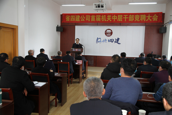 公开竞聘选贤才,四建才俊展风采。2021年2月24日,省四建公司首届机关中层正职岗位竞聘会在四楼培训中心举行。30人(次)英才跨上讲台,畅谈自己对11个中层正职岗位的履职目标和创新举措,为公司各部门的管理献计献策。这是公司成立以来首次机制改革大规模人才选拔考评活动。公司党委书记董事长董富强发表开赛致辞和总结讲话。公司党委副书记、纪委书记、工会主席李怀生主持竞聘大会。