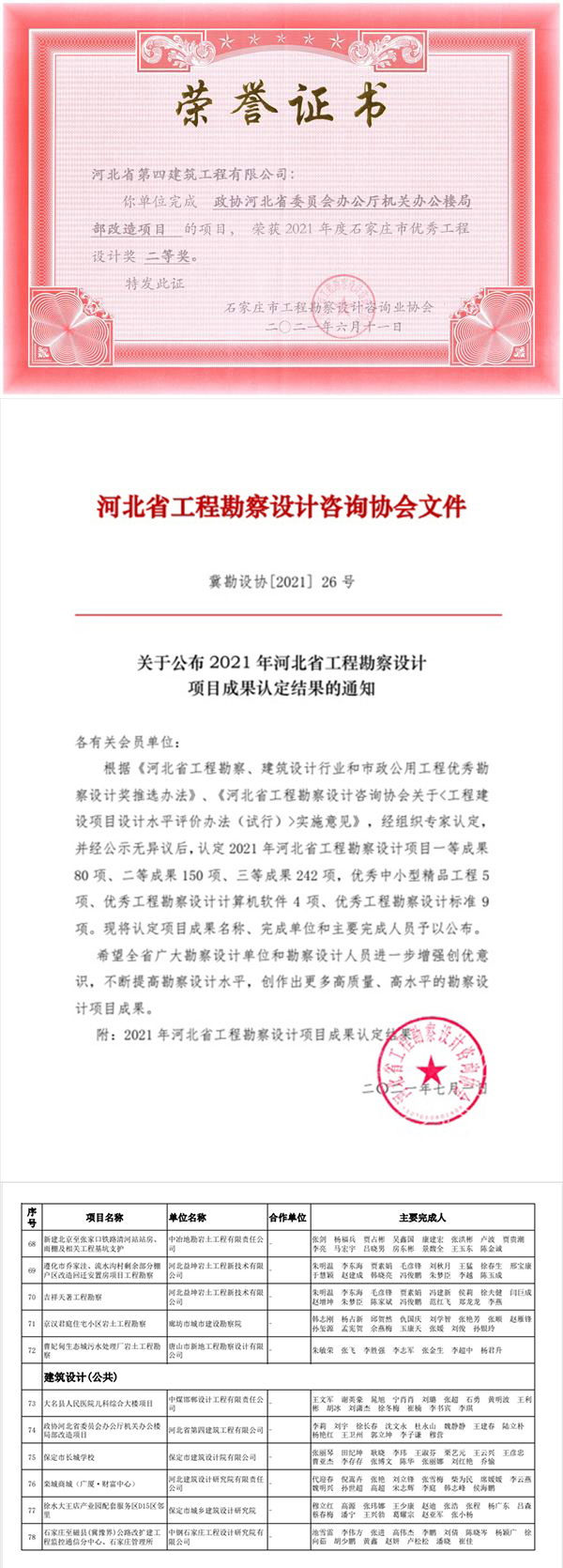 7月5日,公司设计院收到荣誉证书和文件,《政协河北省委员会办公厅机关办公楼局部改造项目》获2021年石家庄市优秀工程设计奖二等奖、河北省工程勘察设计项目成果奖三等奖。
