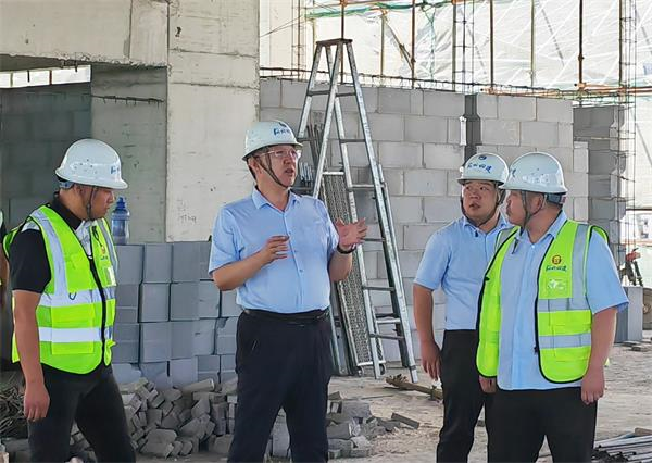 随后,唐志强深入施工现场实地检查。看到B馆和C馆钢结构正在施工,他叮嘱项目部切实做好暑期安全保障工作。在正进行二次结构施工的A馆,他仔细查看了主体结构梁板柱和二次结构砌筑情况,对施工质量表示满意;详细询问了施工人员数量,提醒项目部加强现场施工组织,确保进度;针对模板异形较多、周转次数少、占用量大的问题,建议项目部多个单位工程统筹策划,合理推进,科学组织施工,保证进度的同时降低成本。