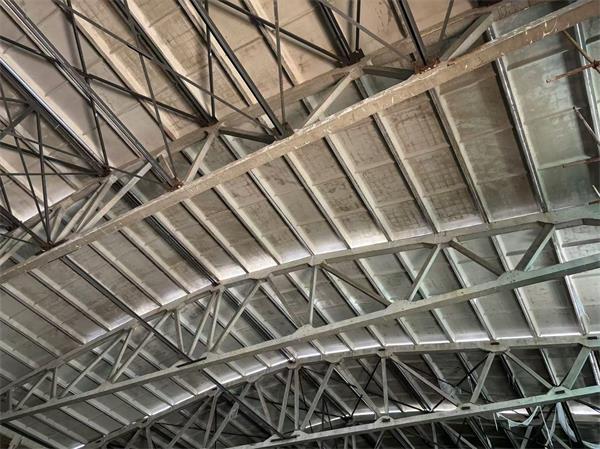 预制过程中,从前期策划到生产队伍的选择,从材料调配到现场人员配置,每一个环节项目部都周密安排。混凝土浇筑时,为减少占地面积,将多榀屋架叠在一起浇筑,并增加人员、机械投入,缩短每榀屋架的施工持续时间,更好的控制混凝土浇筑质量。针对预应力折线形屋架尺寸超大且薄、内部预应力大、运输不便等难题,项目部采用综合吊装法,从平房仓山墙处开始,第一榀屋架与山墙进行连接,随后沿平房仓长度方向依次进行屋架吊装。吊装时选用2台80吨汽车吊同时进行作业,聘请经验丰富的专业人员现场指挥,安管人员全程监护,确保施工安全。